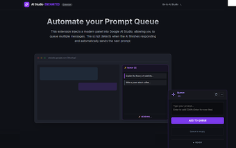 إضافة Google AI Studio Enchanted Queue هي إضافة مجانية لمتصفح Chrome مصممة لتحسين تجربة المستخدم داخل Google AI Studio. يقدم هذا الأداة ميزة قائمة الرسائل الذكية التي تسمح للمستخدمين بتكديس عدة مطالبات وإرسالها تلقائيًا في تسلسل. من خلال استخدام هذه الإضافة، يمكن للمستخدمين إنشاء سير عمل أكثر كفاءة وتنظيمًا، مما يكون مفيدًا بشكل خاص لأولئك الذين يتفاعلون بشكل متكرر مع مطالبات الذكاء الاصطناعي.